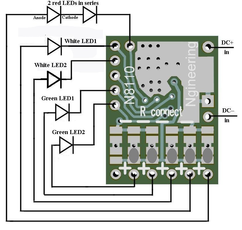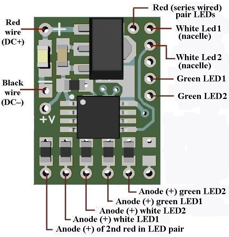 Product & installation overview: The The N8110-13 is programmed to realistically simulate the port (red) & starboard (green) navigation marker lights of Star Trek® Enterprise version NCC1701A. Additionally, their are two outputs for white LEDs for marker lights for the warp nacelles.