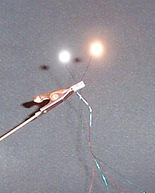 Here are our 2x3 Super LEDs side-by-side. We're using a neutral gray background, no filter on our digital camera, and the photo has not been enhanced or retouched in any way. We used fill-in flash when taking the photo to prevent too much contrast "bloom", but even with that, the light sources are so bright that the camera resolves them as circular "dots" of light. As you can see, our Super-white LED (on left) produces a very pure-white light output. Our new Super-incandescent LED (on right) produces the color output typical of a tungsten filament (incandescent) light source.