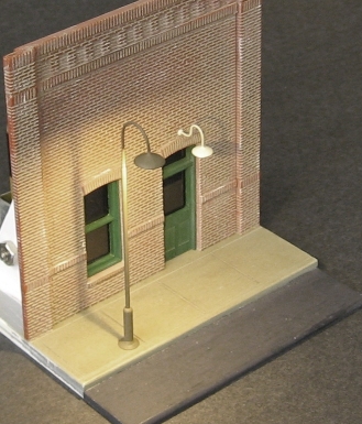 Below is an example of our N1022C high-intensity Super-incandescent LED mounted up under the lampshade of an HO streetlight. Notice the warm incandescent color and how much light floods down from this LED. Even when viewed in normal room lighting, shadows from the lamp pole and gooseneck lamp are seen on the building front.