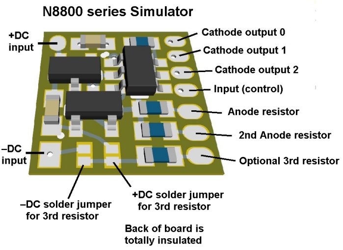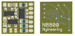 The N88XX simulator module is slightly larger in physical size (0.375" x 0.375") as compared to our original N80XX, .NLA80XX, NLD80XX & L80XX simulator modules (0.310" x 0.310"). The reason for this difference is that we have placed all of the components on the front side of the board and have replace the through-hole solder points with top-surface solder pads for wire connections.. This allows the back of the board to be electrically "blank" for situations that require direct mounting to modeling surfaces without concern about electrical shorting issues or flat surface requirements. The N88XX series has the same on-board 5-volt DC precision regulator for output voltages and supports a DC input voltage range of 5.6-18 volts. The on-board microcontroller has three programmable outputs and one input for control functions just like ourN80XX series. It also has on-board DC polarity protection which can be usefull for model railroaders in Analog applications that require lighting effects that operate in forward track polarity but not in reverse. Additionally, we have provided a front surface placement for a third current limiting resistor and two pair of solder-jumper pad sets for configuring that resistor's connection to either –DC (ground) or +DC (+5-volts). This N88XX series can be programmed for any of our existing lighting effects.