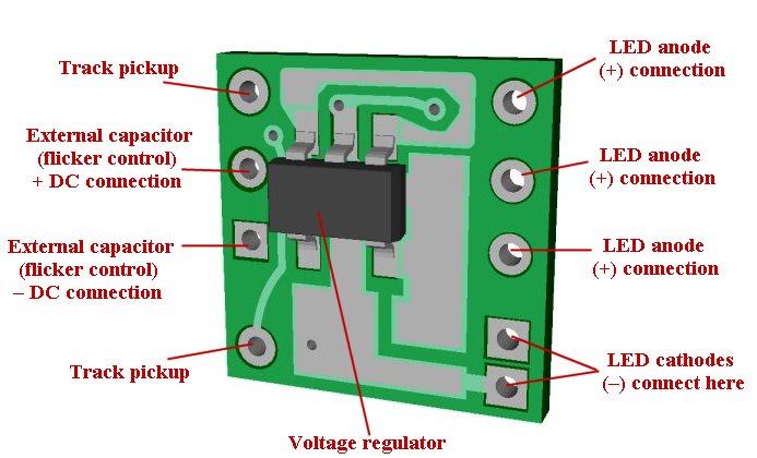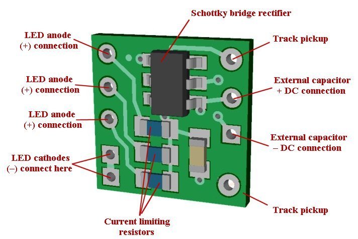 Connecting the NL8104B is quite simple. This circuit is designed for bidirectional track polarity so it will function for both DC (analog) and DCC operations and function in both forward and reverse motion operations. It is configured for up to 3 LEDs of the 3.3-volt (white variety - white, warm-white, incandescent, yellow-white, sunny white, etc.)type. Figures 1 and 2 below highlight the components and connection points of the circuit..