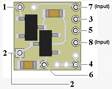 Simulator operation: 1. Right Turn Signal operation: Solder point 7 is input control for the right turn signal function. Connecting this point to DC – (point 2) turns on the right turn signal. It will continue to blink as long as this point is connected to point 2 2. Left Turn Signal operation: Solder point 8 is input control for the right turn signal function. Connecting this point to DC – (point 2) turns on the right turn signal. It will continue to blink as long as this point is connected to point 2 3. Hazard Light operation: Hazard flasher are enabled by simultaneously connecting points 7 and 8 to DC – (point 2). Hazards will continue to flash as long as these two points are connected to point 2.