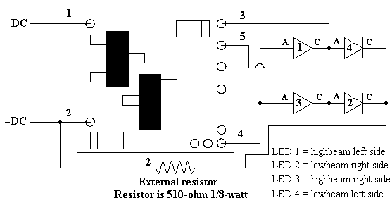 as shown in Fig 2 below). Using wire appropriate for the size of the LEDs and their placement in your project, connect the LED anodes (A) and cathodes (C) together as shown in Figure 2 below. Note that LEDs 1 & 2 are a series pair (wired anode to cathode) and LEDs 3 & 4 are a second series pair. Anodes of LEDs 1 & 3 are connected in common to solder point 4. Cathodes of LEDs 2 & 4 are connected together and in series with an 510-ohm resistor (included with this packages, plus a spare)