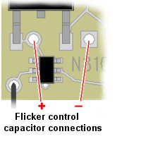 External flicker control capacitor connection (N8104-2 and N8104-3 Figure 2 below shows the solder points on the board for wiring of an externally connected flicker control capacitor. The round pad is the + (positive DC) point and the square pad is the – (or ground) connection.