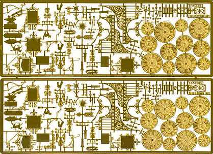 Also on this fret are numerous weather vanes complete with distinctive decoration (cat, rooster, sunburst, etc.), various ornate sign boards for storefronts, cafes or pubs, and... several wrought-iron style plant or sign hangers. There is an amazing amount of incredibly detailed N-Scale hardware on this fret. Our pictures don't do it justice, and... there's 2 sets of everything!
