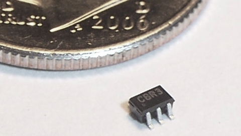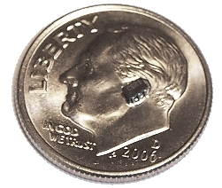 Here's a closer image with the dime in the background. For modelers, this full-wave bridge rectifier will fit anywhere, and because the center pin on each side is not internally connected, wiring to the 4 corner pins is greatly simplified. The center pins can even be snipped off or bent out of the way for easier wiring if necessary.