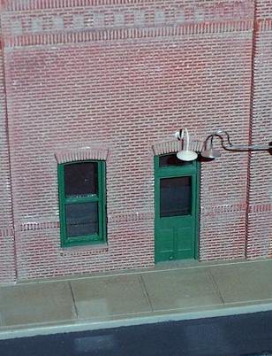 Here's an HO storefront with with a typical gooseneck mounted over the door and a second (unpainted) lamp held next to it. The mounted lamp contains one of our Micro Super-white LEDs and the unpainted lamp has our Micro Super yellow-white LED installed. We've taken this photo with flash and the LEDs turned off just to show the respective lamp positioning. Please excuse the shadows.