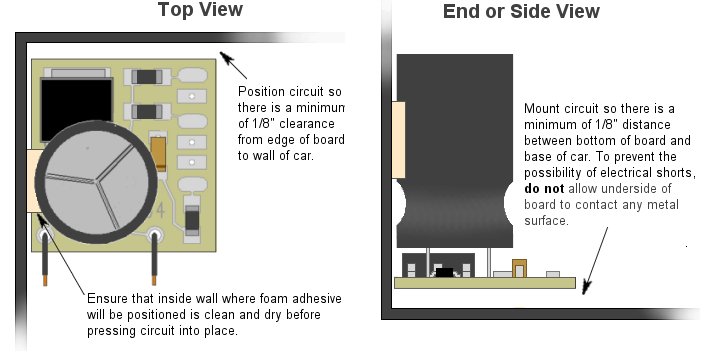 Figure 1 Figure 2 and 3 below show proper positioning of the circuit when placed inside a typical model railroad car.