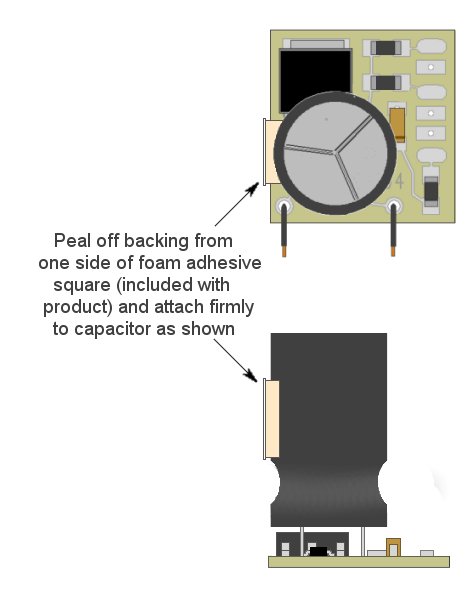 Mounting the N8014-1 (capacitor installed) Included with each N8104 is a small square of double-sided foam adhesive. Figure 1 below shows where to attach the adhesive to the part. Ensure that this adhesive pad is firmly pressed into position on the capacitor as shown. Do not attach the adhesive pad to the bottom of the circuit board. This area of the board is designed as a heat sink for the circuit and can get warm (if input voltage is above 18-volts).