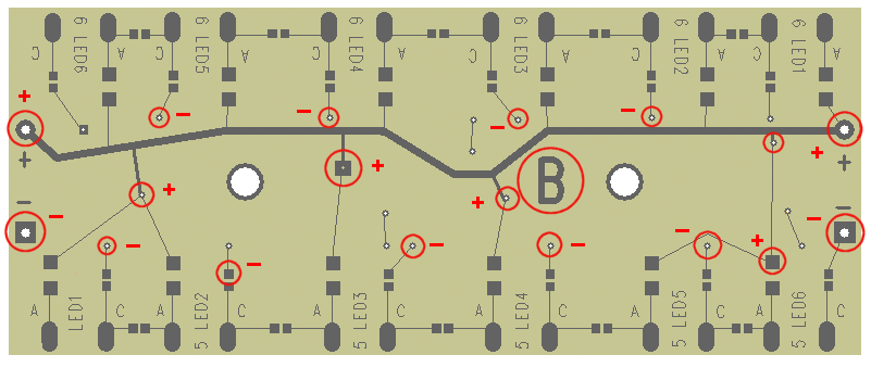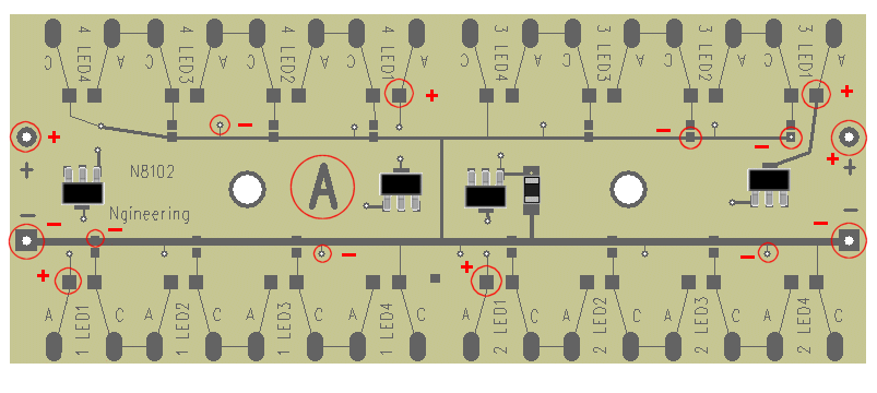 Powering Simulators from the Side A of the board In certain situations, it may be convenient to use the LED Power Distribution Board as a connection point for power for our Lighting Effects Simulator products. Our Lighting Effects Simulators have their own voltage regulators on-board, so they can be directly connected to the N8102 whether it is being used with our N3512 12-volt, or our N3518 18-volt Power Supply. All that is required is connection of the + and – DC power wires from the Simulator(s) be connected to the + and – voltage rails on the Power Distribution Board. There are many points where wires can be attached. Figure 1 below shows several of those locations circled in red.