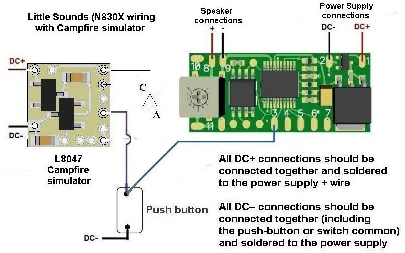 wires during installation Important note: A low-wattage iron with a pointed tip should be used for connection of wires. Too much heat or solder can easily damage the wires.The NK8047L and NK8047BL includes the addition of a latching function that starts the lighting effect by grounding the violet wire connected to pin 6 and is timed to start the N8301-084 or N8501-084 or N8502-084 Campfire sound effect (sold separately). See Fighre 1 below. If the sound module being used is a N8301-084 (Little