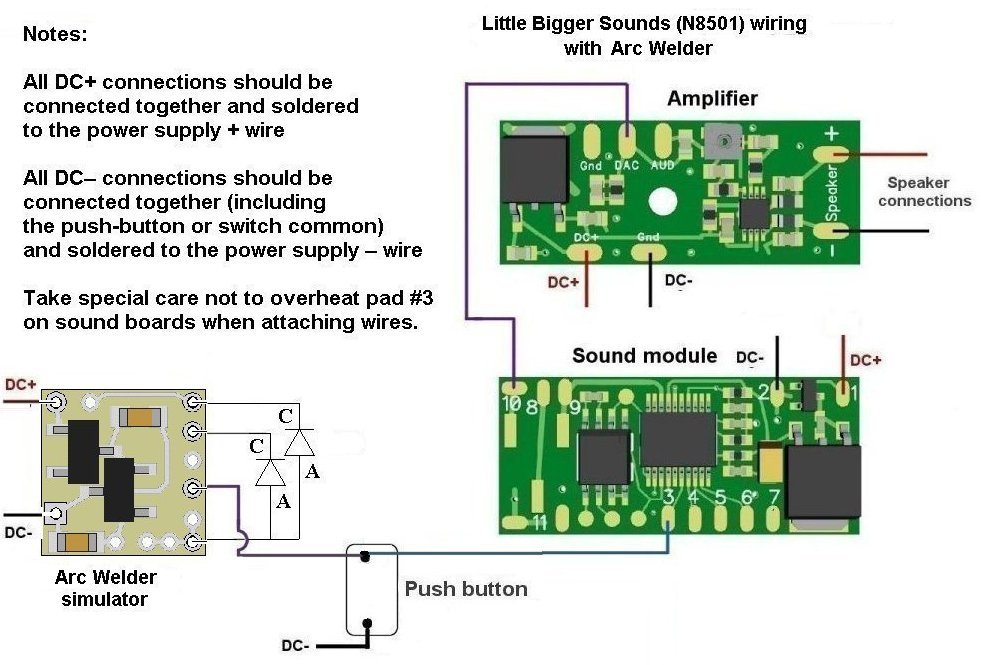 Figure 2 This grounding can be easily achieved by simply connecting (thru a push button) to a common –DC power connection. An example of this is shown in Figure 3 below. In this example, the N8501-099 (Little Bigger Sounds) version of the sound effect is shown.