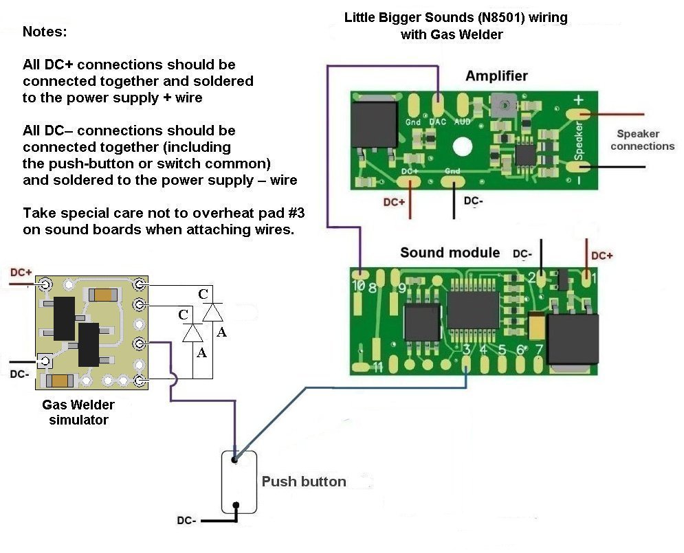 Figure 2 This grounding can be easily achieved by simply connecting (thru a push button) to a common –DC power connection. An example of this is shown in Figure 3 below. In this example, the N8501-092 (Little Bigger Sounds) version of the sound effect is shown.