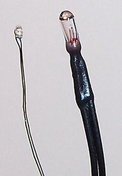 Here's a close-up of the smallest incandescent bulb available, the popular 1.2mm size ; and our Nano LED (on the left) wired-up with our #38 wire. In certain model railroading situations, incandescent lighting can provide a very desirable effect. Having said that, here are a few additional considerations: