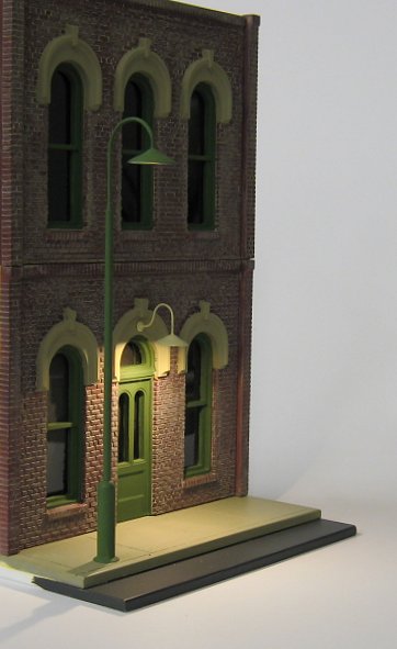 We built up this small diorama of two-story building front using DPM's modular wall sections mounted on .060" styrene for the sidewalk and small section of street to show our example of a gooseneck light over the doorway and an 18-ft. tall streetlight. Both lights are fabricating using our tubing and lampshade products, and both use our N1022C high-intensity Incandescent 2x3mm LED (the streetlight uses 2 LEDs mounted side-by-side). Both pictures are in normal room lighting. Note the shadows created by the flood of light in both pictures. If you are interested in building either of these light fixtures, email us and we will be happy to provide dimensional drawings and parts lists. © 2008 Ngineering