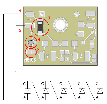 Figures 1 shows a typical off-board wired series group. Details are noted by a red circled area and corresponding comments. The corresponding numbers are described below: 1. Shows the anode solder pad for the connection of the first LED anode in the series group. 2. Shows the cathode solder pad for the connection of the last LED cathode in the series group. 3. Shows the placement of a current limiting resistor on the resistor solder pads for the group. 4. Shows the cathode grounding-bridge pads. Apply solder to these 2 pads to bridge them together. This will complete the series group connection to the board. 5. Shows bridging pads to connect on-board cathode connections to anode connections. DO NOT apply solder the these bridge connections when performing off-board series wiring.