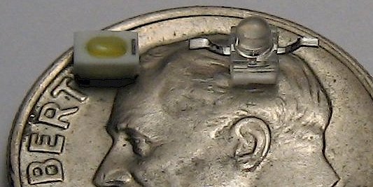 Here's a close-up view of two of our LEDs on a dime. On the left is our N1021 2x3 white LED, and on the right is our N1042 Subminiature red LED. If its leads were formed down against the side of the LED housing (very easy to do), the Subminiature would actually have a smaller footprint than the 2x3.