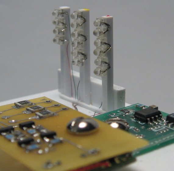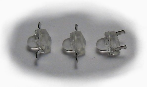 Shown above are three of our Subminiature LEDs with their leads formed in different ways. On the left is the way the leads are shaped when the LED is unpackaged. In this position the face of the flat leads are in line with the face of the square LED housing. This would accommodate mounting the LED against a circuit board with the domed portion protruding through a hole in the board. This will work fine for panel-mount type applications. In the center view, the leads have been straightened out flat by squeezing them with a pair of small needle-nose pliers. In the right-hand view, the leads have been bent straight down along the sides of the LED's square base. This provides the smallest footprint and still allows easy soldering of wires to the leads. We used this form and attached several groups of the LEDs to strips of styrene using standard styrene cement. for a demonstration module for our N8103 Booster Board (see below)