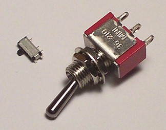 Here's a standard miniature SPDT toggle switch next to our very tiny SPDT slide switch for comparison. These little switches can easily be mounted in N-Scale rolling stock to turn on/off or change lighting and other special electrical features. See the Photos link by this product for an example.