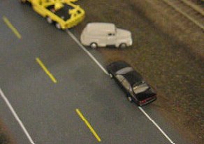 Below is a photo of an N-scale unmarked state patrol car at the scene of a derelict van being readied for towing. Click your mouse anywhere on the image to start the video. Video files require time to download, so please be patient. Note: This video is not enhanced or retouched and is taken with full room lighting.