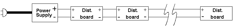 Wiring up multiple "sub-boards" to a common power source is an efficient way to share a power supply. This is commonly referred to as a power bus and there are several things to remember when using this wiring scheme: